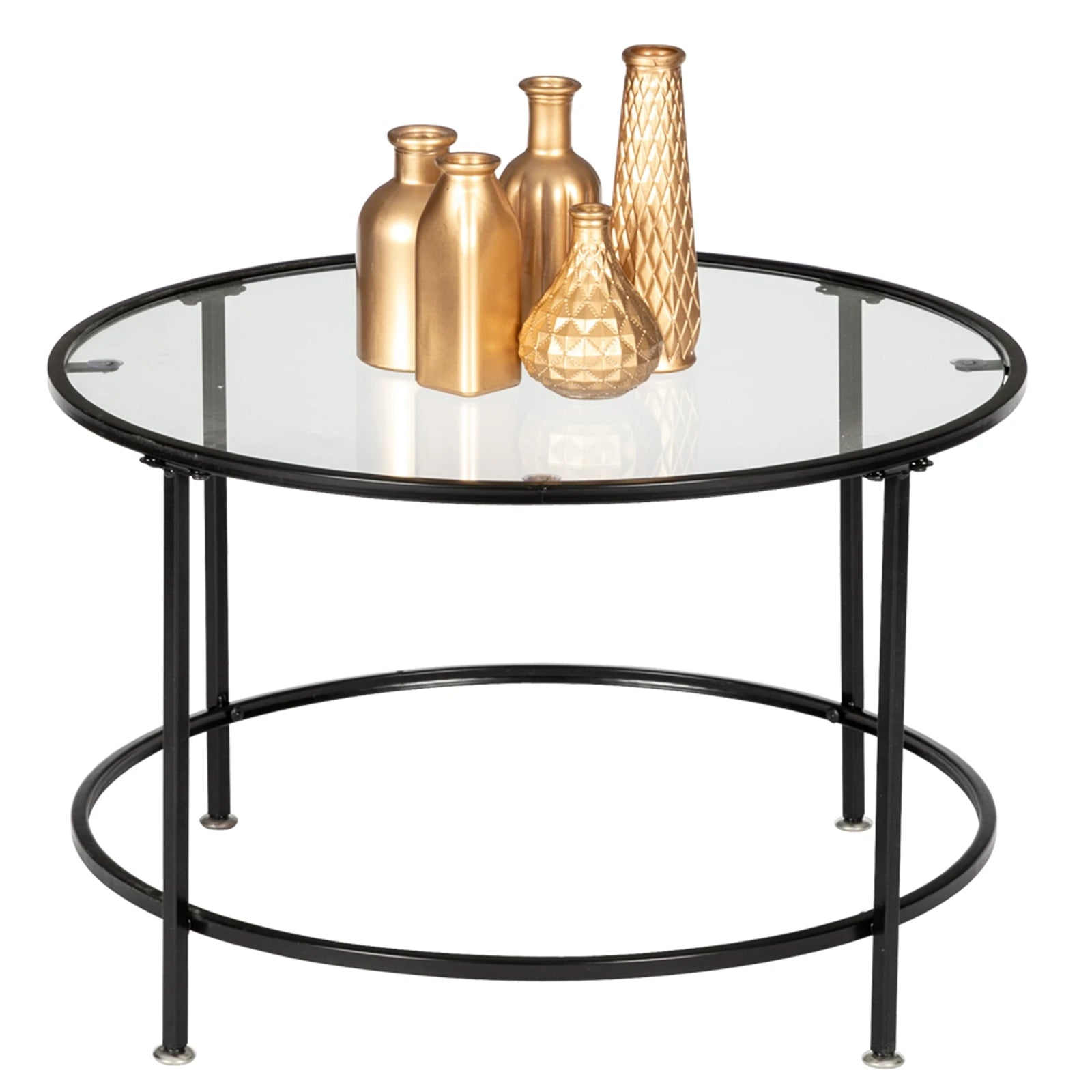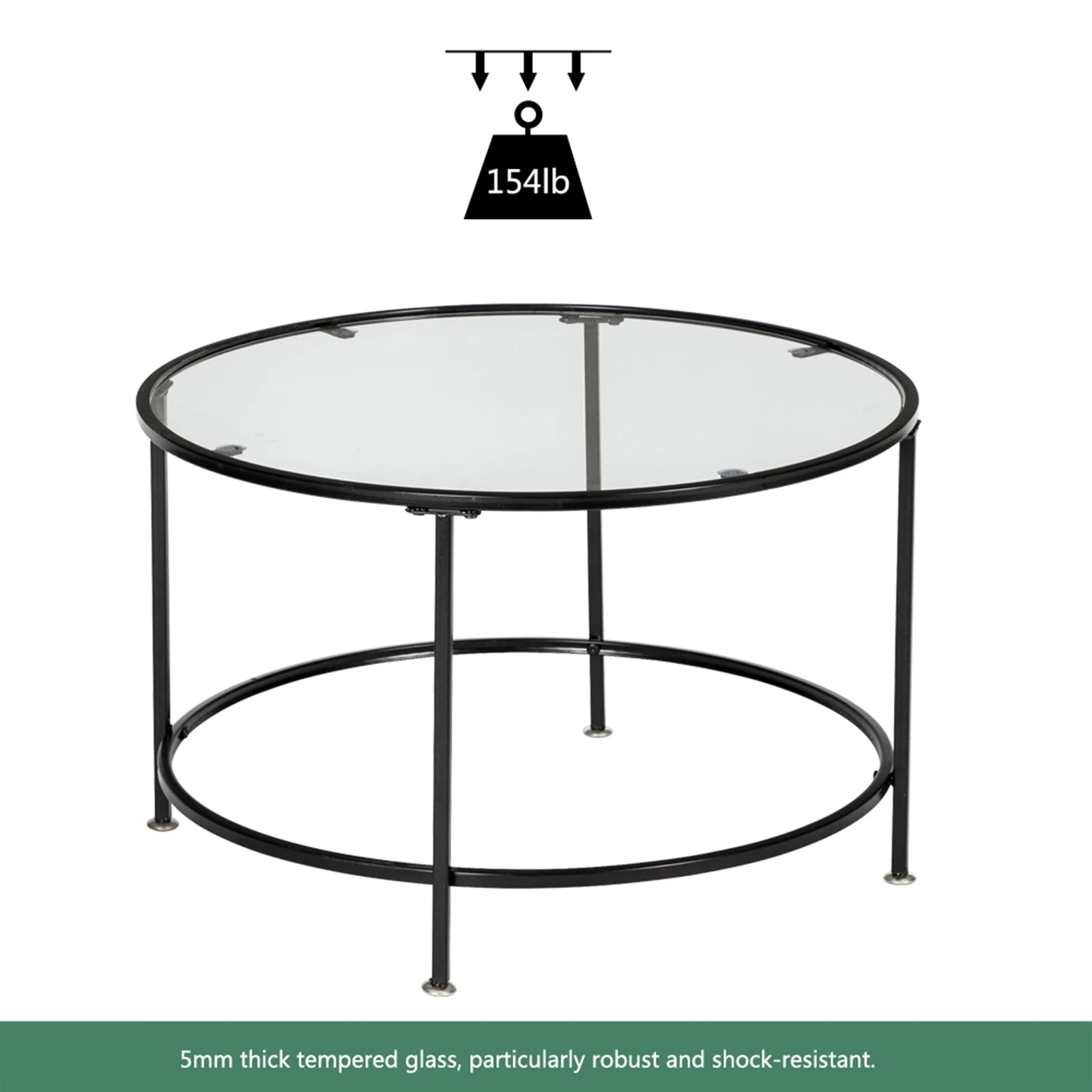 2-Tier 5mm Thick Round Tempered Glass Coffee Table with Black Wrought-Iron Frame