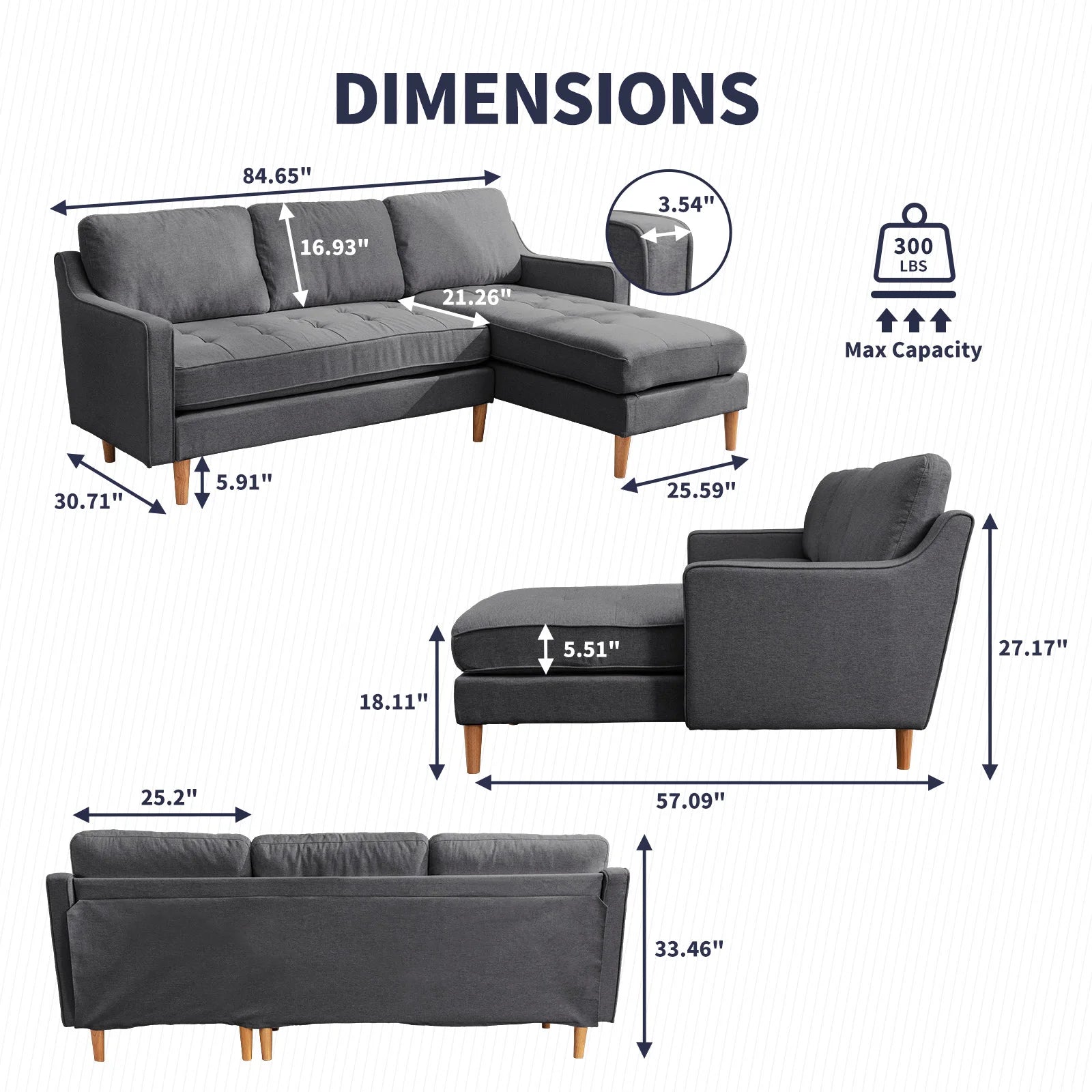 Modern 84" L-Shaped Sectional Sofa and Chaise Lounge with Solid Wood Base